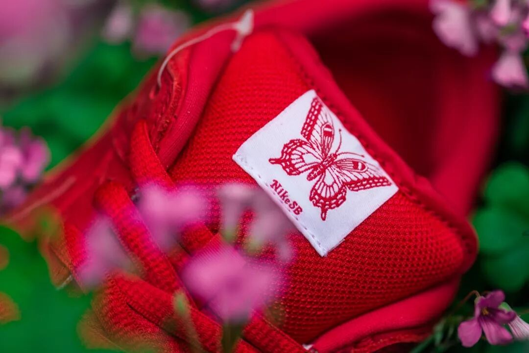 这双鞋整体以细腻的红色麂皮覆盖,后跟处有 “Girls Don't Cry” 的白色刺绣,鞋舌上也缝有 Girls Don't Cry 的标志性蝴蝶图案