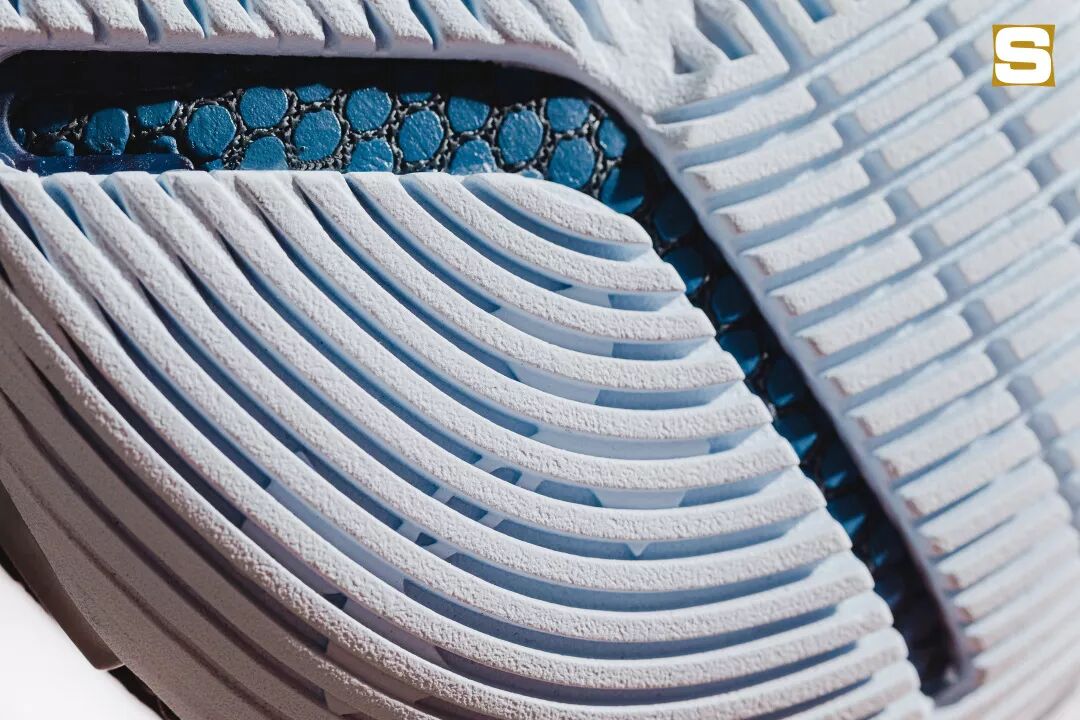 在鞋身与中底上一致采用了渐变的蓝色作为主色调,