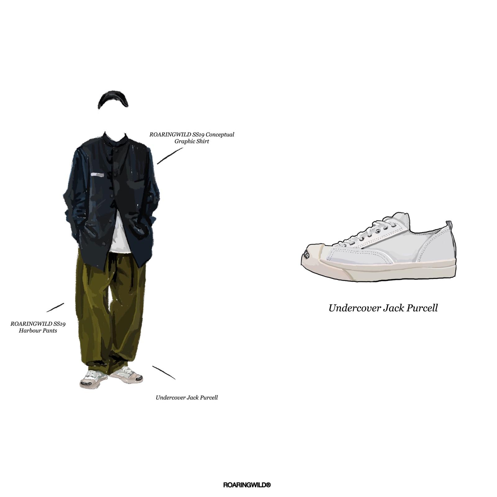 在UNDERCOVER 2014A/W伊势丹限定中发布的UNDERCOVER x Converse Jack Purcell才是匡威低帮帆布鞋的正确打开方式,棱角分明的皮革物料鞋身与鞋头开口处的印花设定让经典的Jack Purcell重新获得活力。而说起Jack Purcell就少不了工装的搭配属性,ROARINGWILD就以军绿色的工牌宽松哈珀长裤配合宽松的衬衫来搭配,就是在这种看似简单的穿搭中凸显UNDERCOVER x Converse Jack Purcell出众的细节感。