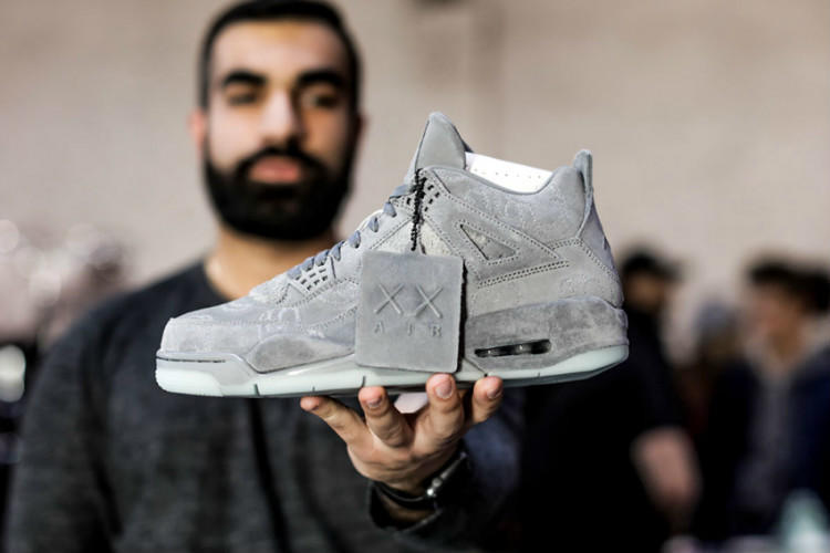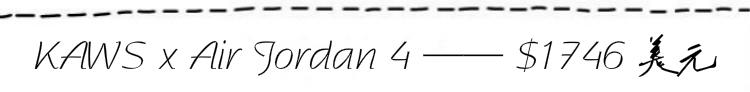 凭借着街头涂鸦艺术家KAWS在潮流圈的不凡人气和凸显质感的全麂皮材质鞋身,让KAWS x Air Jordan 4鞋款的信息一经发布便拥有了超凡的人气。经典的KAWS元素与Air Jordan 4鞋型的搭配,再加上限量发售这一惯用技俩让这双鞋款的市场价格轻松突破万元大关。