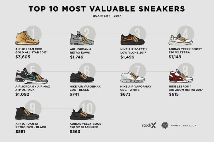 你知道2017年第一季度哪十双鞋最贵吗?专业球鞋数据网站StockX 联手潮流媒体Highsnobiety以及插画达人Kick Posters,为我们带来了2017年第一季度球鞋市场十大最贵排行榜。究竟是哪十双鞋具有如此之大的吸金能力,让我们来一一揭晓。