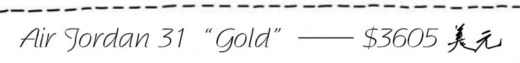 Jordan Brand为了庆祝今年在新奥尔良举行的NBA全明星赛,特意在当地开了一家期间限定店。其间展示出了土豪气息十足的Air Jordan Gold系列,带有金属质感的鞋身在灯光的照耀下熠熠生辉,而这双限量发售的 Air Jordan 31“Gold”更是一举登顶了第一季度最贵的十双鞋的榜首。