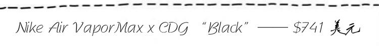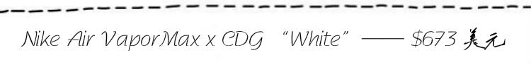 Nike在Air Max家族的30周年之际,除了向这30年来的辉煌历程致以敬意的同时,也在不断的继往开来、开拓创新——带来VaporMax全掌气垫跑鞋的面世!而在今年频频与Nike携手推出联名鞋款的日本服装品牌COMME des GARÇONS,也以独特的设计诠释了CDG x Nike VaporMax——Flyknit编织鞋身上取消了鞋带的设计,搭配以全新的可视化外露气垫,带来科技感满满的视觉冲击力。