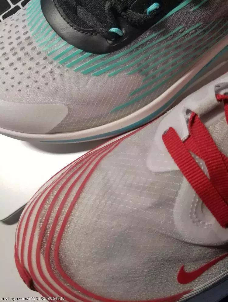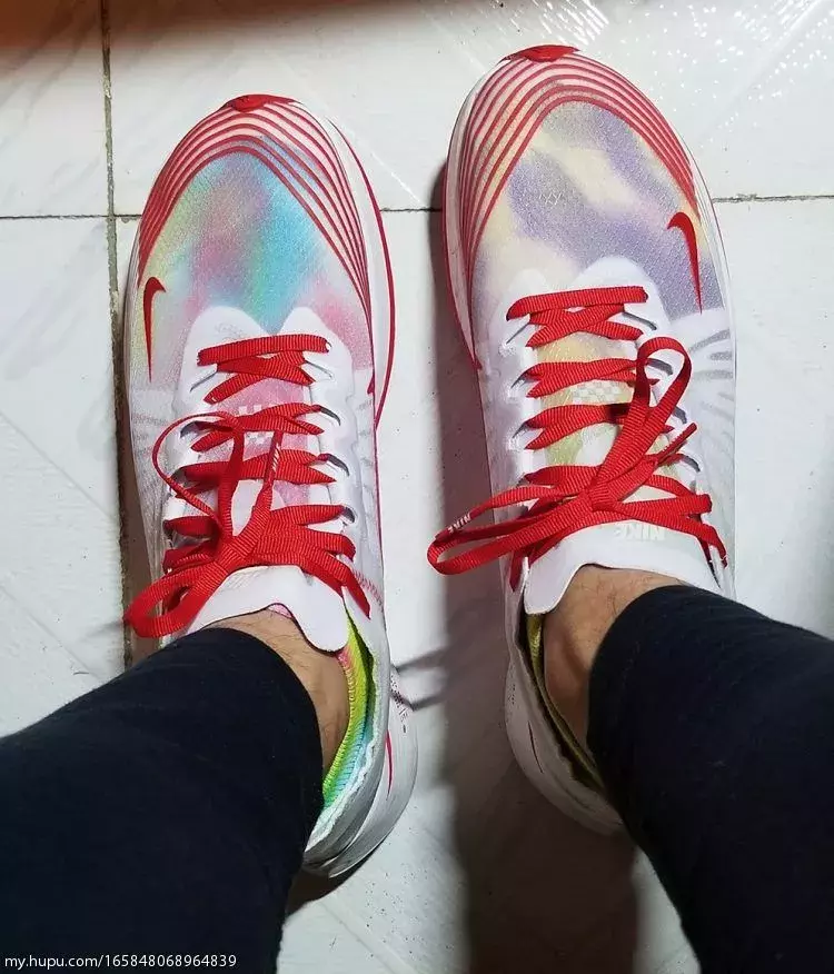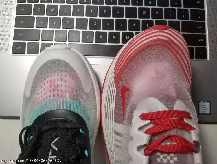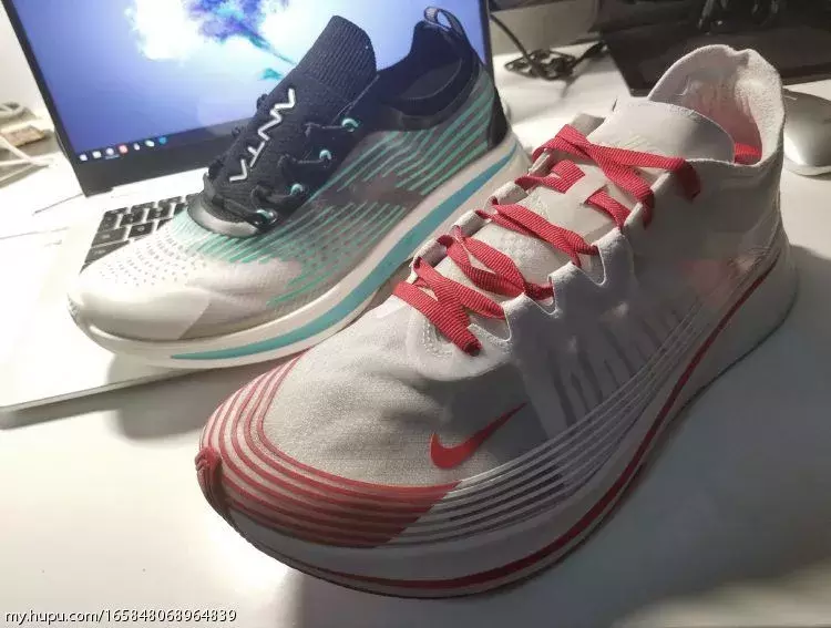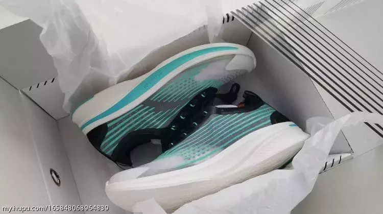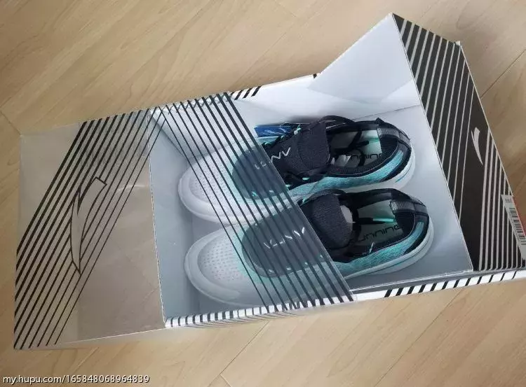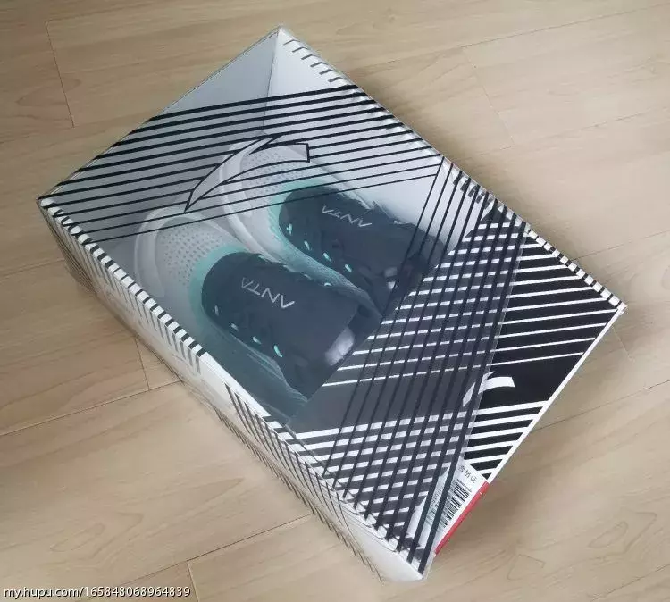 抄袭肯定不是,首先流畅条纹都是各种跑鞋常用的设计;透明鞋面也算是最近一个流行趋势,各家都出了自己的透明鞋,包括耐克的几双,匡威的ow all-star,阿迪的350镂空,李宁也出了一双透明的云跑鞋。就好就行老爹鞋各家都在出老爹鞋一样。可以说,是设计语言相似的两双鞋,定位是不同的。恰逢母亲节,在半个月前老妈就反复暗示想要一双新鞋,挑了又挑也没有合适的,遂昨天直接带老妈去了商城,由于老妈脚码比较尴尬,这边商场各家最大女码到39,走了几家都没有合适的,最后老妈看中了这双男码40的安踏氢跑鞋,简单试穿后老妈很满意,我就直接拿下了,商场价格肯定不如淘宝好,85折370块,不过老妈很喜欢并且真的不实际试穿一下尺码不敢瞎买。买回来肯定是要和我的zoomfly做一下对比,立马拿了出来开始拍几张首先鞋盒非常有设计感,一半透明的抽屉鞋盒,不对称设计,透明材料上的纹路也和鞋上的条纹类似,可以说很惊艳!去掉纸后可以透过鞋盒清晰的看到鞋子,和透明鞋面传达出一样的话:看到你想看的(借用下aj2010的词儿)
