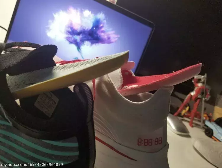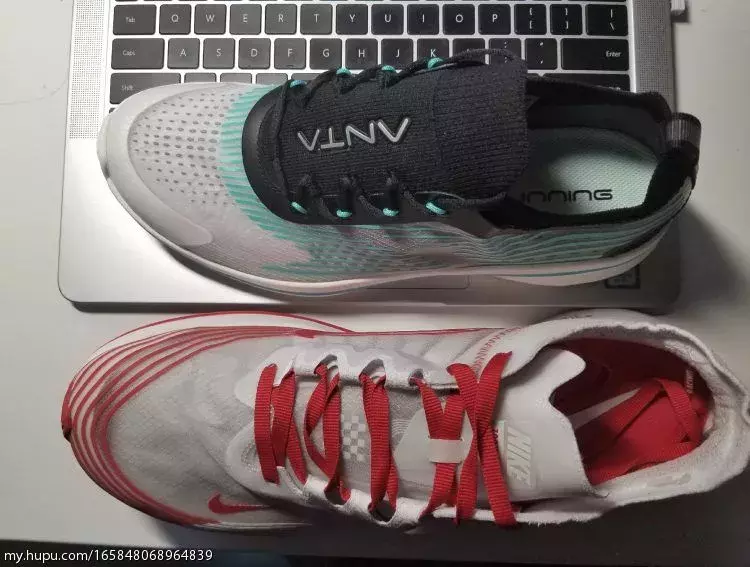 可以看出除了相近的配色和设计语言外,形状几乎是完全不一样的。侧面看前掌倾斜幅度差不多,实际上脚感受完全不同,nike专业的优势这时就体现出来了,全掌的支撑板穿上去就有带着你前倾跑起来的感觉。安踏的脚感一言难尽,跟我的安德玛拖鞋差不多,就还算软没别的感觉,另外安踏这双透明面的韧性要比外网面那双支撑性和韧性看起来都要好一点,网面那双没买不多说了。有人说鞋身的线比较像,nike这个更像是跑道的图案,安踏这个就比较像速度发散条纹了