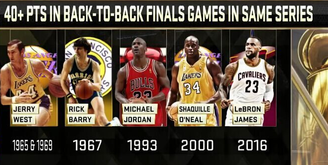 总决赛连续两场砍下40+,之前只有5次总决赛出现连续40+的情况。
