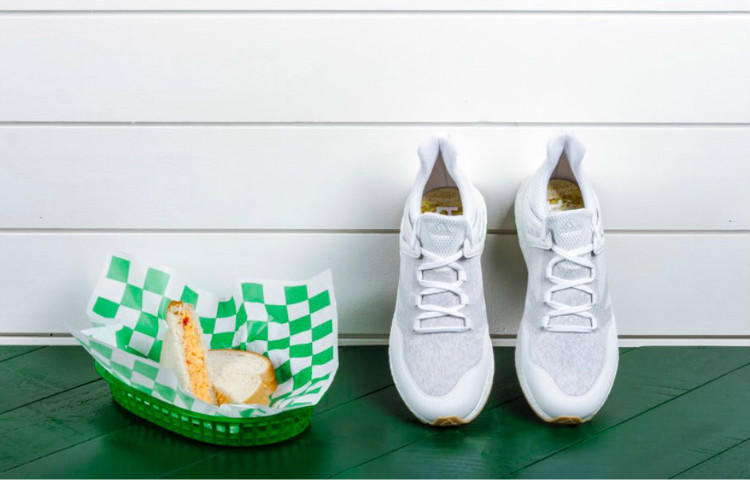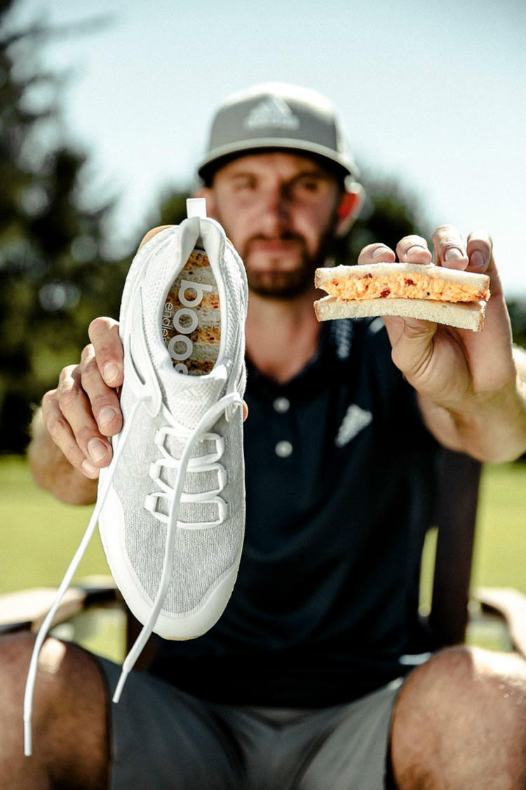 高尔夫运动的小众并不妨碍这项运动为我们带来精品鞋款,adidas Golf就颇具创意的以Augusta National Golf Club的一道招牌菜Pimento Cheese Sandwich(甜椒芝士三明治)为灵感主题,打造了一双名为adidas Golf Crossknit Boost“Pimento Cheese Sandwich”的鞋款。白色Circleknit织物鞋面与带有绿色点缀的中底象征了盛放三明治的餐布,而鞋垫上则是以更加直接的方式来体现主题——印满了三明治图案。