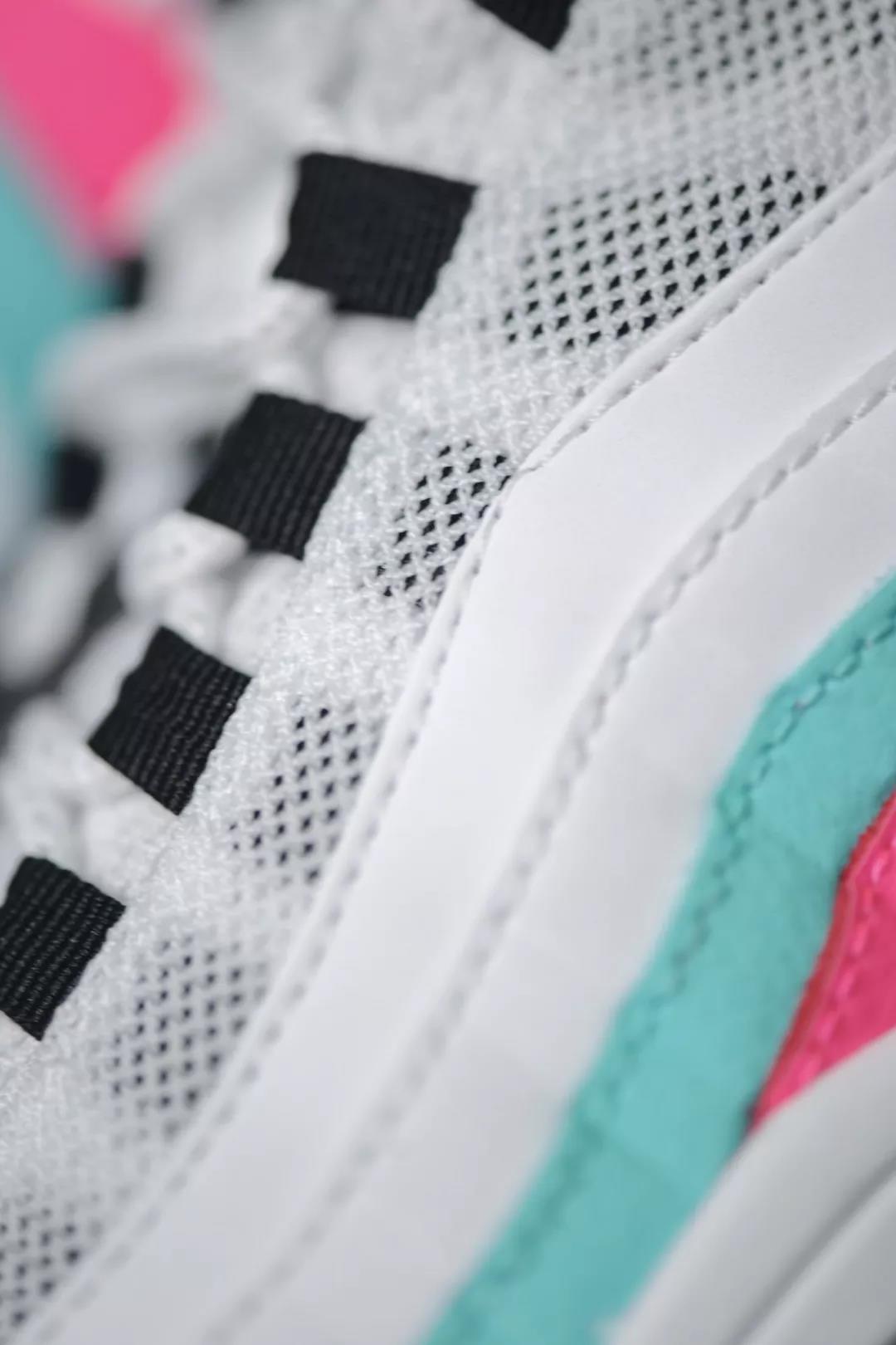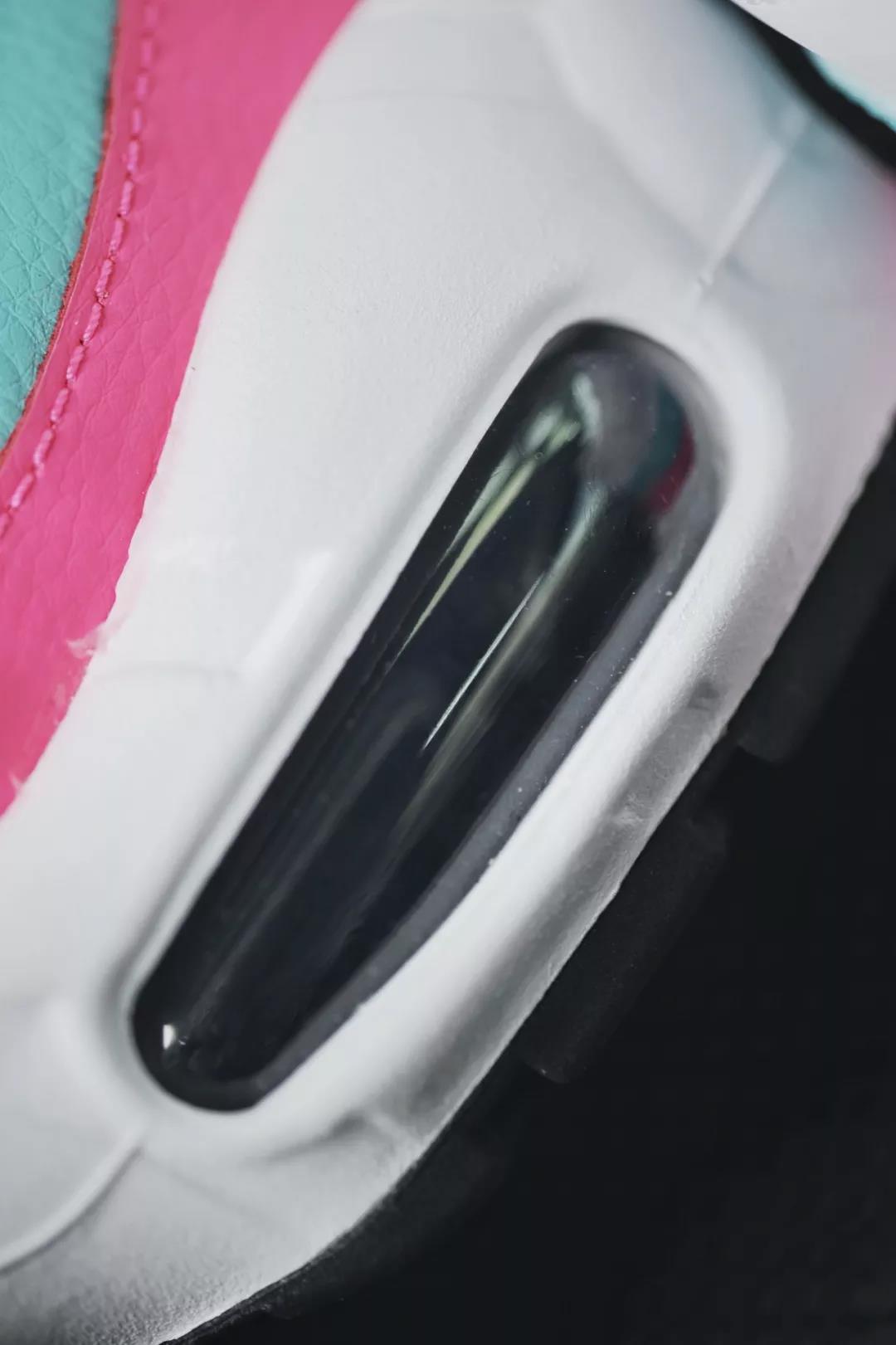 鞋舌的粉色细节与粉色鞋垫呼应后跟的青色 NIKE AIR 字样与鞋身呼应