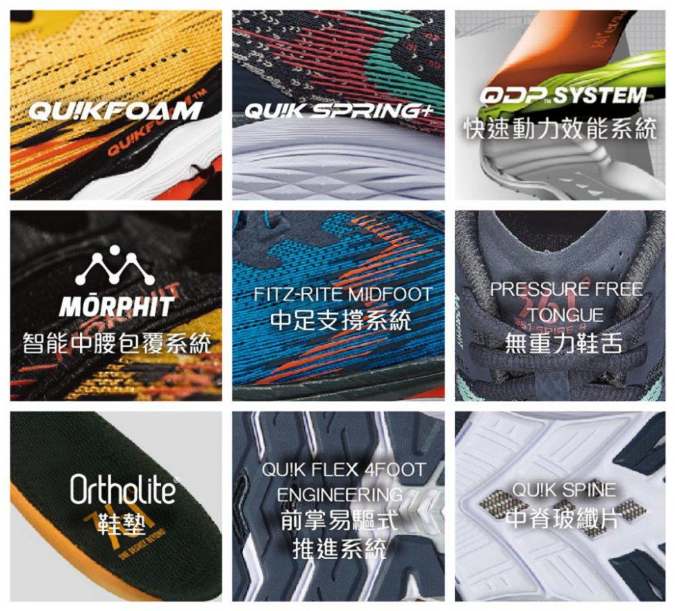 3. QDP 快速动力效能系统:整合上述一、二两点科技,透过波浪型曲面达到扭转冲击成前进动力,且针对脚部每一段不同需求,调适出对应的缓震或回馈表现。