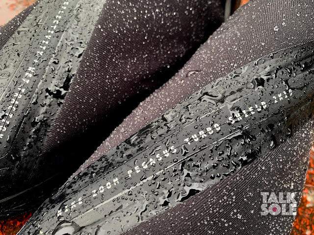 来到这次Turbo Shield的密封式鞋面,是完全地阻隔着雨水,而且鞋筒增高令雨水沿足踝位置进入的状况也再减少了。布满水珠的表面就知道其抗水性能是怎样了。