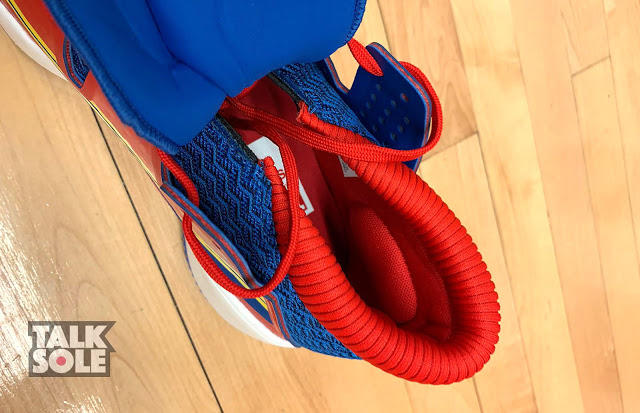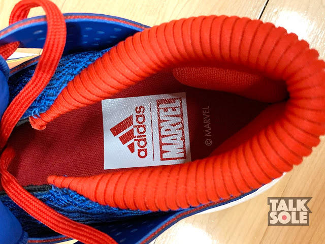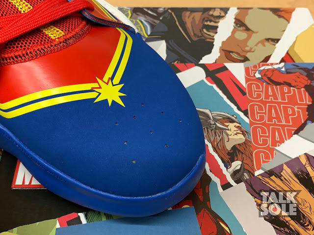 初次穿着容易,在松掉鞋带后能把整块鞋舌翻起,穿上后鞋身较硬,可能是因为特别配色要做出 Captain Marvel 的造型,用上的色块较多,令鞋身柔软度下降,前掌折曲时会被色块影响折曲的位置(可参考附图),透气度亦受到影响;全掌 BOUNCE 中底,前掌较薄及感觉不明显,而后掌弹力适中,能提供足够的缓冲,但亦只是足够,未能跟 BOOST 带来的舒适相比。