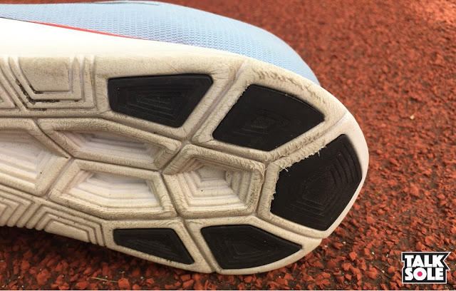 经过40km+后的洗礼,后跟外侧的损耗较多,要注意的是黑色部分才是橡胶外底,只覆盖了前掌以及后跟一少部分。照情况看来,是因为尽量减低鞋身重量而减少橡胶外底的范围,所谓又要马儿好,又要马儿不吃草,耐用度还是有进步空间的。