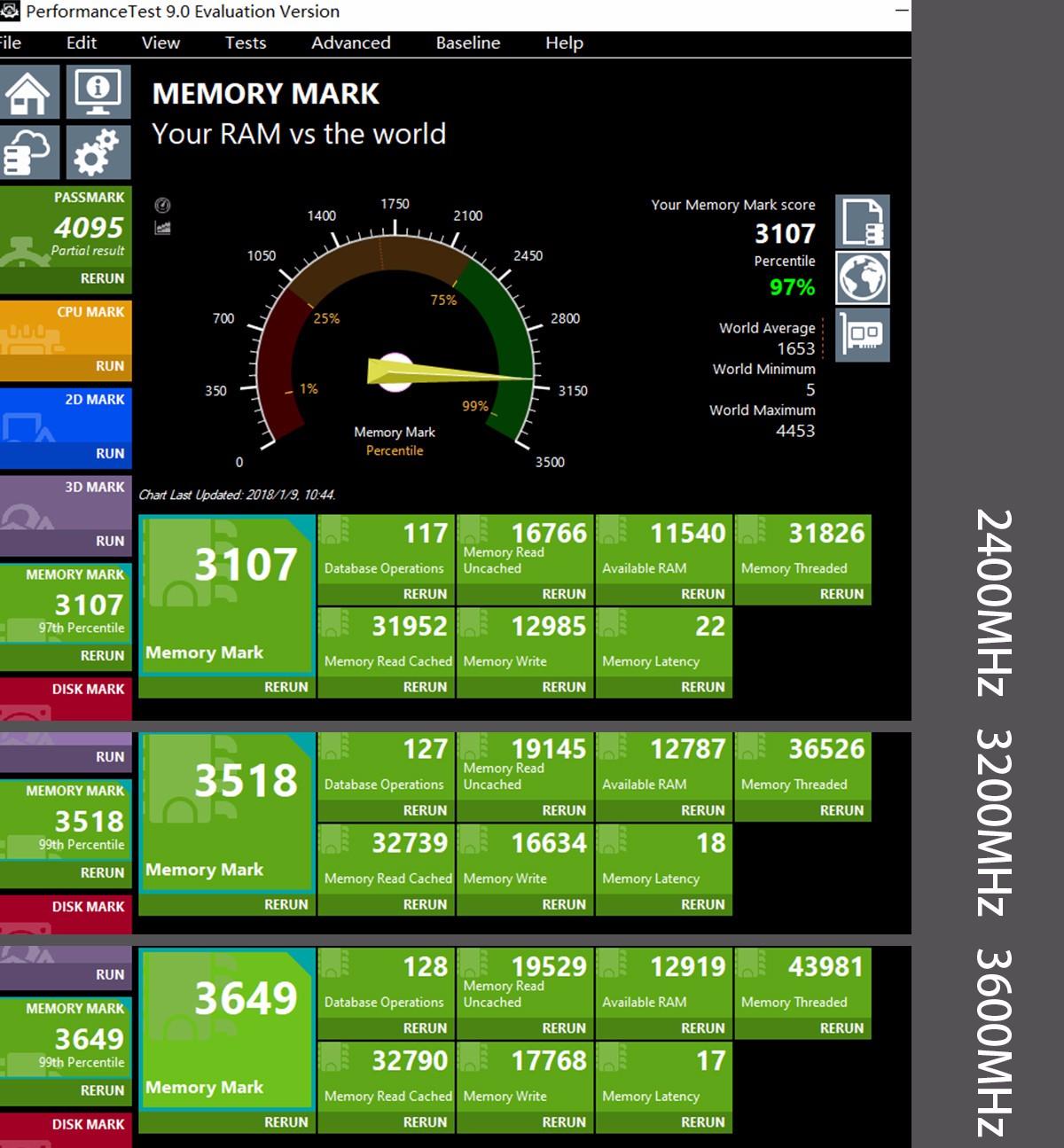 ▼Passmark Performance Test 9.0测试,2400MHz、3200MHz和3600MHz的评分分别为3107、3518和3649MIPS。从2400MHz提升到3200MHz分数提高了13%,从3200MHz再提高到3600MHz,分数只提高了~4%。