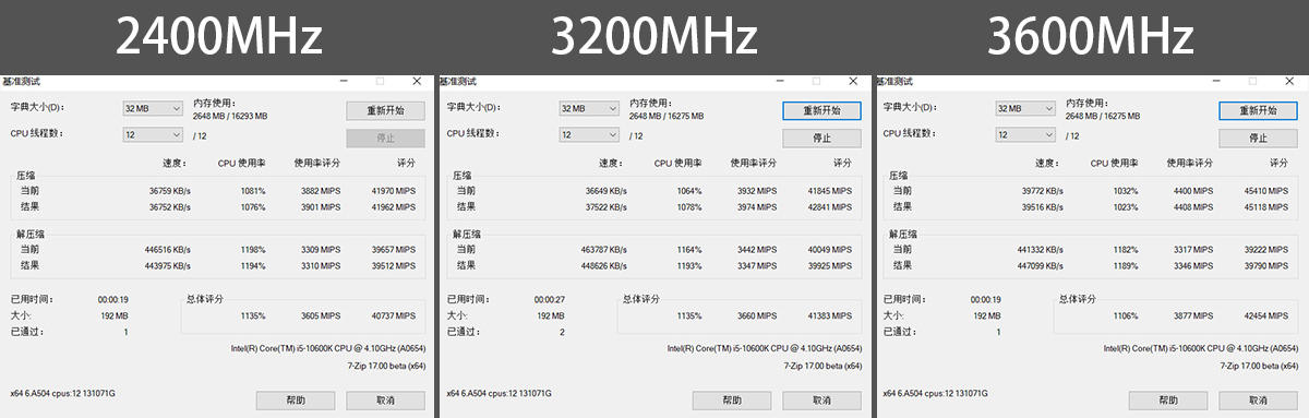 ▼当然对于一些实际应该,内存频率对于其的影响幅度还是相对比较的,比如zip基准测中,2400MHZ、3200MHz和3600MHz对应的评分分别为40737MIPS、41383MIPS和42454MIPS,随着频率提高,性能表现也只是提高了2~3%。
