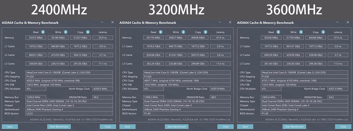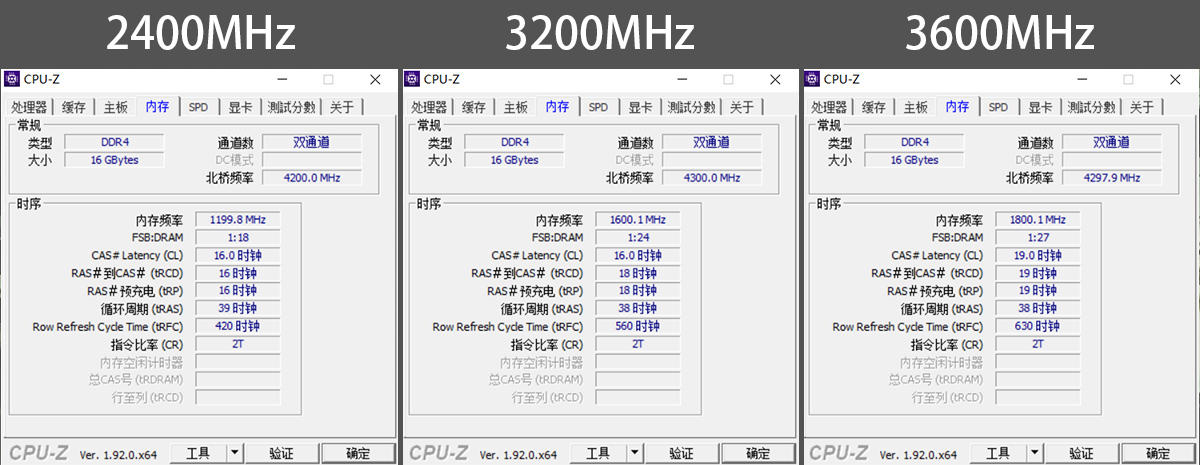 从成绩上看当然是从2400MHz提升到3200MHz的性能提高比较大,毕竟频率提高了30%以上,读写性能也提高了接近30%,另外延迟也降低了15%;再提高到3600MHz,频率提高幅度变小,读写性能提高了~12%,延迟方面也就稍低了一点点。