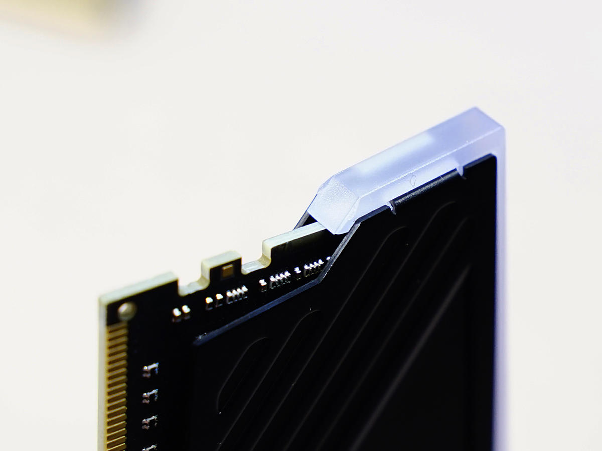 ▼顶部导光条一直延伸到内存尾部并包裹住了一部分。另外也能看到内存采用了黑色的PCB,官方介绍其为8层PCB ,电气性能更加优秀。