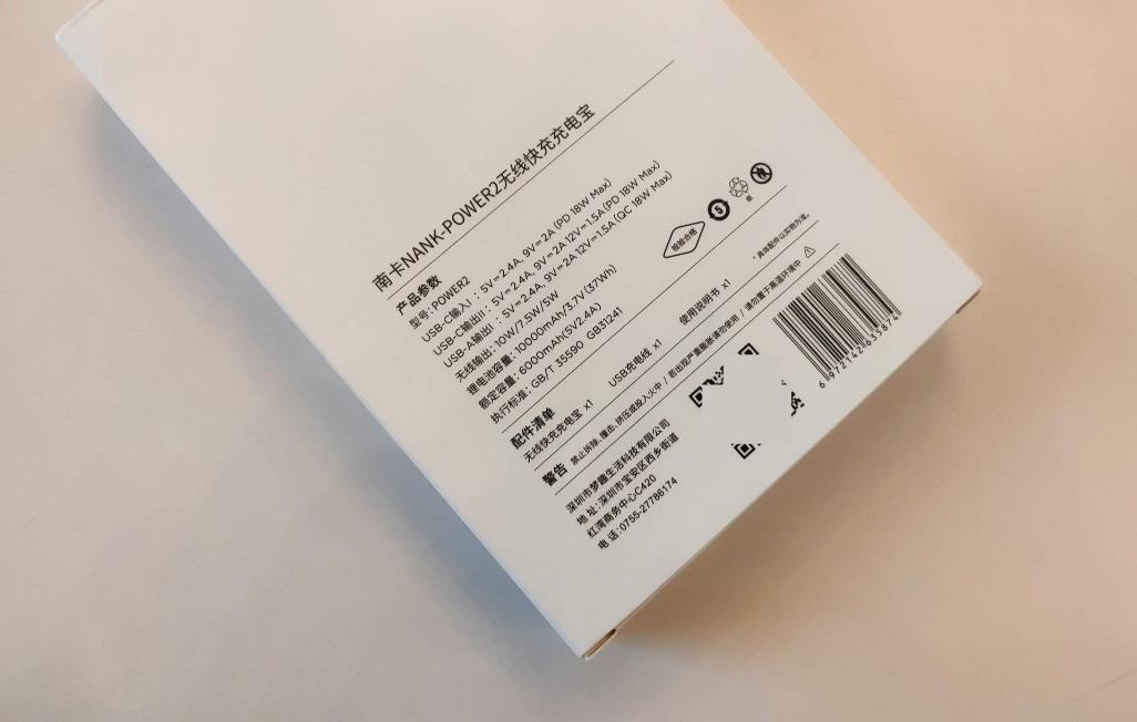 与南卡以往的产品包装不同,无线充电宝POW2的包装更倾向于互联网的简约风,纯白色的硬纸壳包装材质,正面除了“nank”的英文品牌名,在底部还有一个特别显眼的红色“南卡出品”标识。