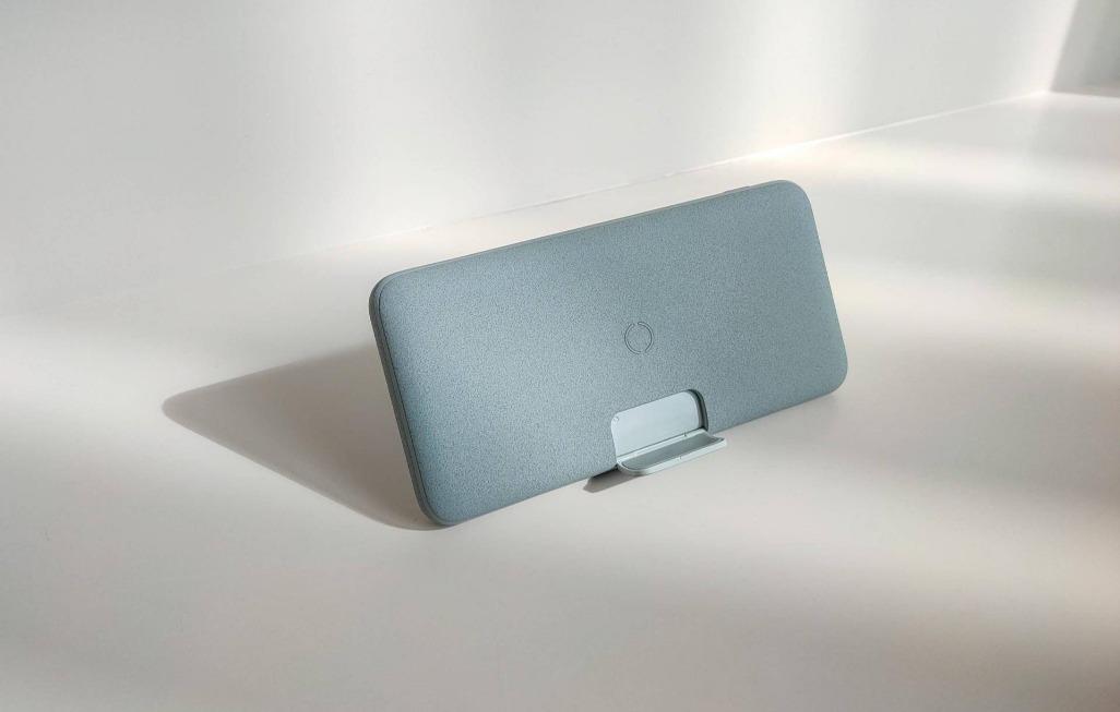 圆环往下有一个隐藏式的小底座,手动打开后就形成了一个手机底座,配合POW2背面的支架,就能够形成一个45°的手机支架,做到边充边放、横放煲剧。看似很小的一个设计,但是正值过年“迁徙”之际,这样的设计能够有效的帮助我们度过漫长的火车之旅。
