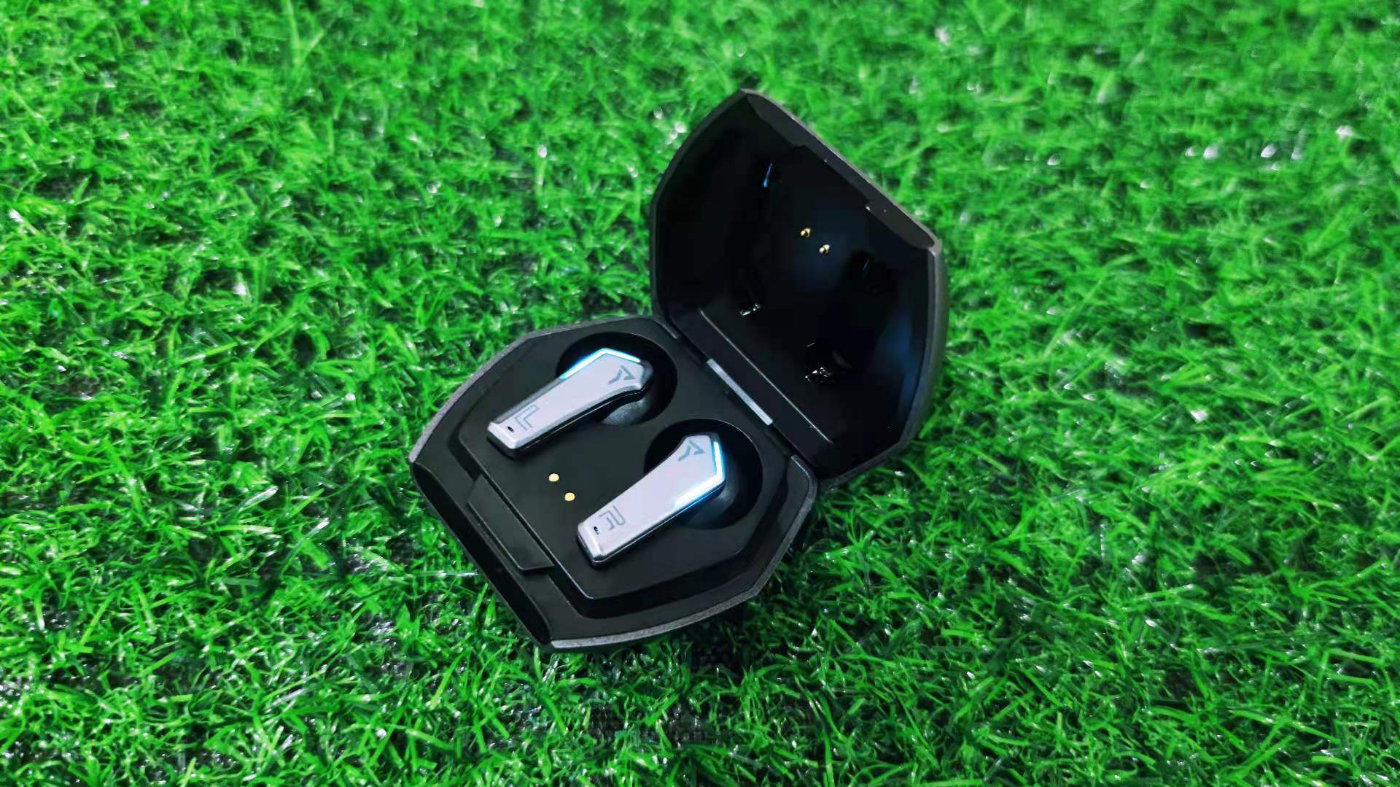从打开耳机盒的那一刻开始,这款耳机就已经给我留下了深刻的印象。耳机充电仓采用了偏扁一些的六边形设计,还是非常酷的,这也是这个价位的耳机中游戏设计感最好的。这也是我觉得这款游戏耳机和其它真无线蓝牙耳机在外观方面最大的区别,就像是现在的游戏手机与普通手机的外观区别。