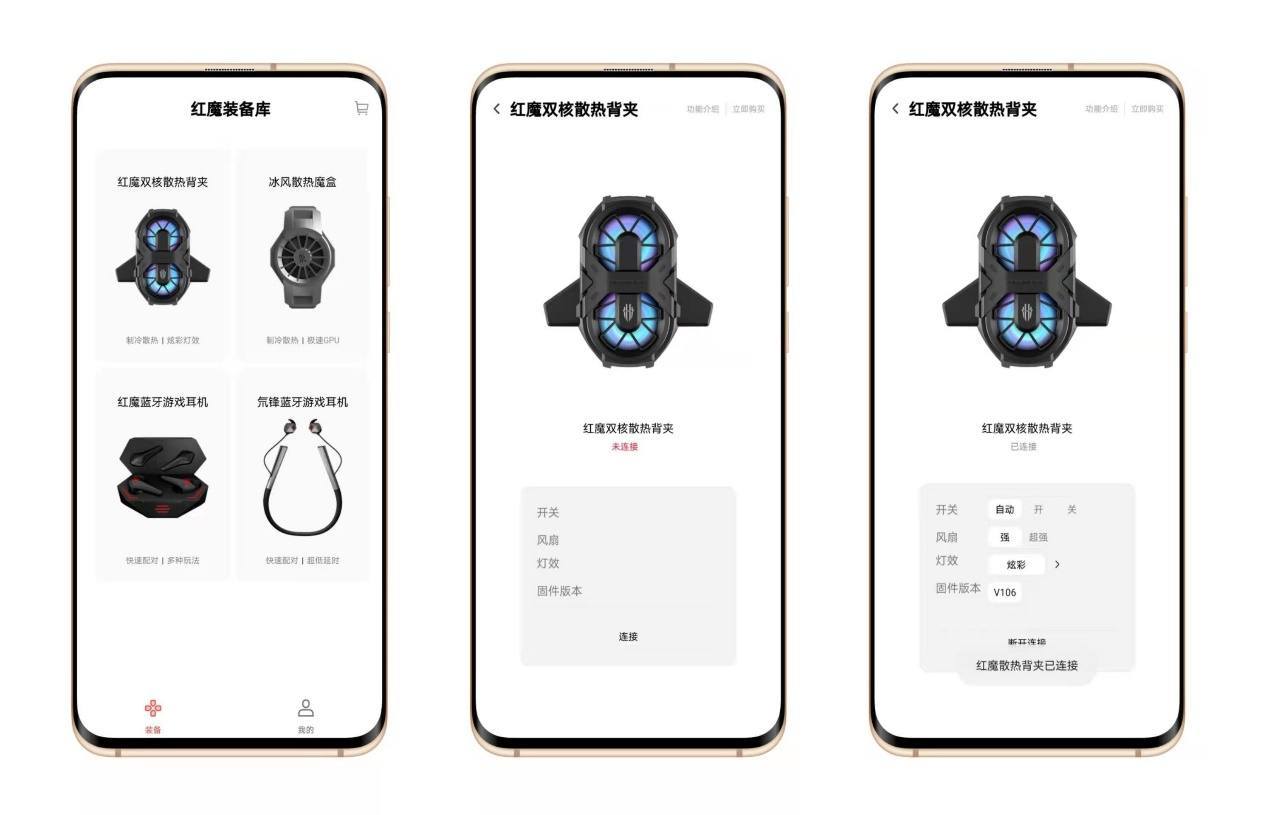 散热背夹设计有配套的APP,在APP中通过蓝牙进行连接后可以设置设备的开关模式、风力的大小以及灯效。