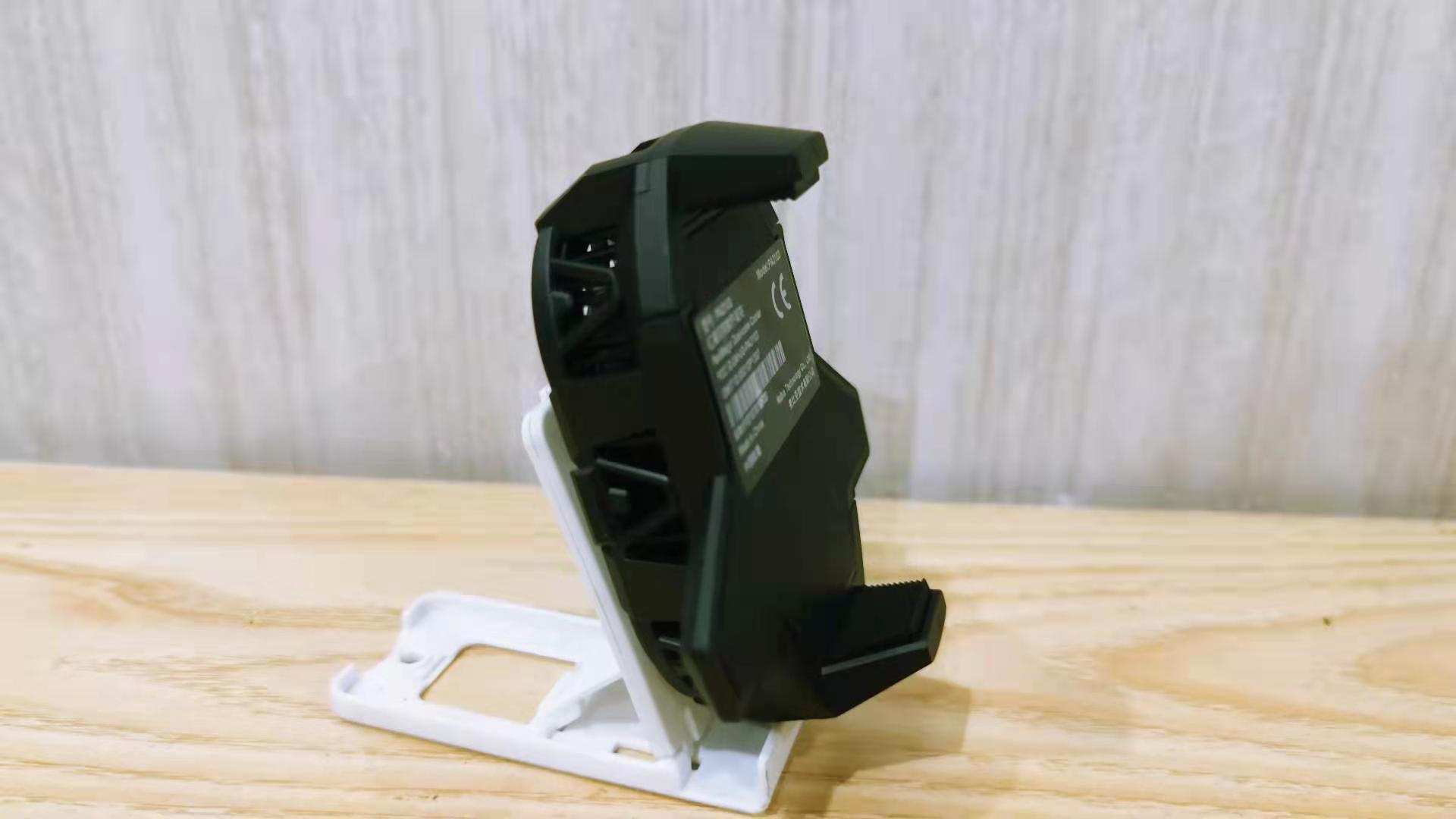 散热背夹的整体像是一个有翅膀的物体,在正面能清楚地看到两个散热风扇,整体的颜值还不错,硬朗的外壳设计也让用户能够感受到游戏的机械感。