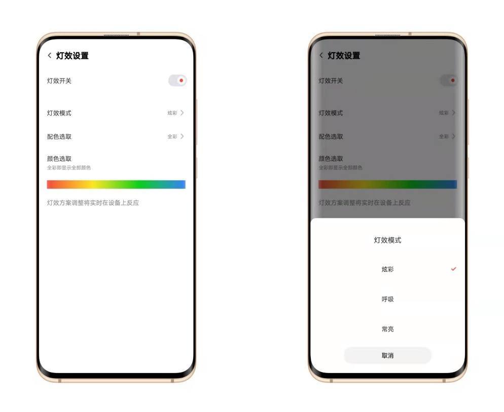 好像提到游戏设备就离不开灯效,无论是游戏键盘还是鼠标,再到现在的手机散热器,灯效都是一大卖点,这款散热背夹的灯效有炫彩、呼吸、常亮三种模式,用户也可同时选择自己喜欢的颜色,用起来还不错。