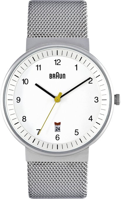 这款博朗Braun Classic男士石英手表内置精确日本石英机芯,外观采用银色不锈钢网链搭配不锈钢表壳设计,沉稳优雅,气质非凡,防刮耐磨矿物玻璃表镜下为白色表盘,表盘上镶有黑色阿拉伯数字刻度,边缘精确到秒,6点钟方向为日历显示窗,时分秒指针,表盘直径40mm,防水深度50m。