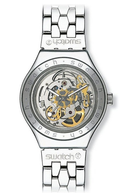 斯沃琪Swatch YAS100G Automatic 镂空全自动机械表男表,精准机械男士手表,银色钢制表带上面采用凹刻,技术印刻字母SWATCH,传统的设计,但确是颠覆传统的造型,透视的机芯金色零件,表盘上麦年未饰有时间刻度,展现阳刚大气真我风格.