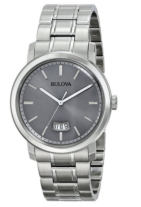 Bulova 96B200 男士石英手表,这款手表采用日本产石英机芯,走时精准,银色精钢表带和表盘,设计经典,灰色表盘,简约化的刻度、指针显示,6点处有日期显示功能,还有30米防水功能,能够抵御淋雨和日常淋水!