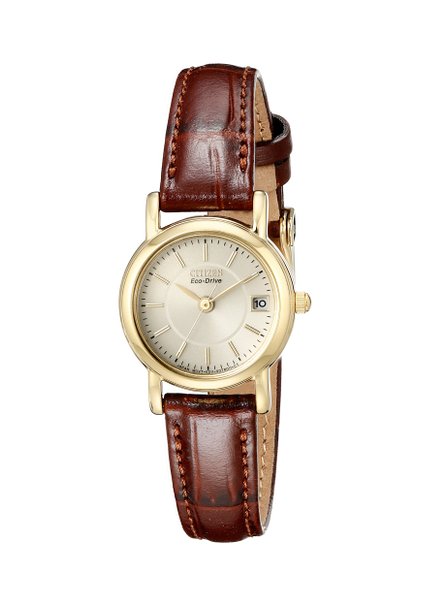 这款西铁城女士光动能石英手表,内置精确日本石英机芯,采用Eco-Drive技术利用自然光供能,无需更换电池,节能环保,外观采用褐色真皮表带搭配金色不锈钢表壳设计,尊贵优雅,气质非凡,防滑痕抗反射蓝宝石玻璃表镜下为金色表盘,表盘上镶有金色全时刻度,边缘精确到秒,3点钟方向为日历显示窗,金色时分秒指针,表盘直径23mm,防水深度30m。