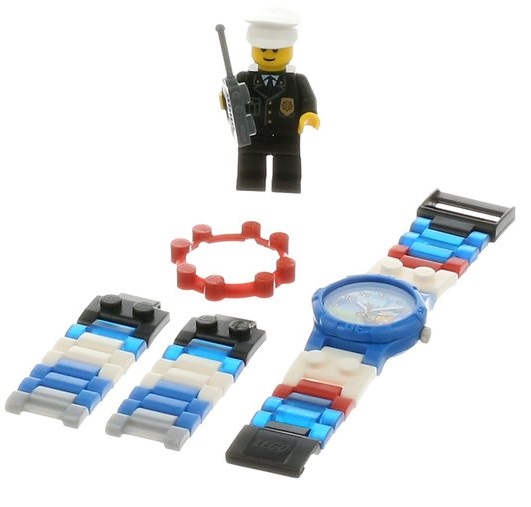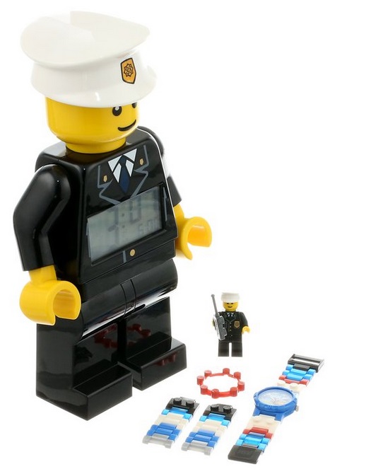 LEGO 乐高 Kid's 儿童系列 手表+闹钟套装,城市警察款,其中闹钟具备电子屏带背光,电池供电。手表为塑料材质石英表,日本机芯,还有造型可爱的小人模型,可以安装拆卸。表带和表壳均采用乐高的组件,每节都是可拆可装,方便调节腕带长短。