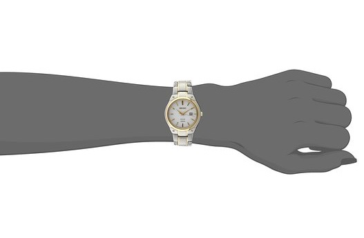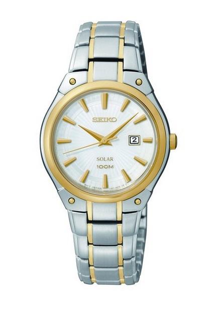 这款Seiko SUT128 精工女士光动能石英手表,内置精确日本石英机芯,利用自然光功能,节能环保,外观采用金银配色全钢表壳表链设计,尊贵典雅,精致美观,防刮耐磨矿物玻璃表镜下为白色表盘,表盘上镶有金色全时刻度,3点钟方向为日历显示窗,金色时分秒指针,表盘直径29.5mm,防水深度100m。