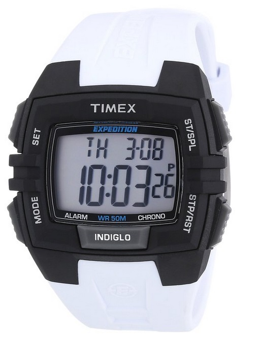 天美时Timex T499019J Expedition Full Size 男款运动手表,这款手表采用树脂材质,耐用耐磨抗摔,运动时佩戴毫无压力,白色表带和黑色表壳的对比强烈,数码显示,带有日历、星期等功能,50米防水,还有背光功能!