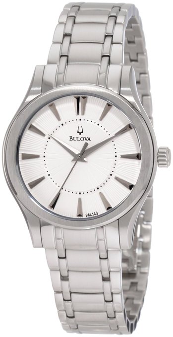 这款Bulova 宝路华 96L143女士经典全钢手表 ,内置精确日本石英机芯,外观采用银色抛光不锈钢表壳和表链,防刮耐磨的弧形矿物水晶表镜下为白色放射纹理表盘,表盘上镶有银色条形全时刻度,内缘精确到秒,12点钟方向为宝路华经典logo,银色时分秒指针,表壳直径28mm,30m防水。