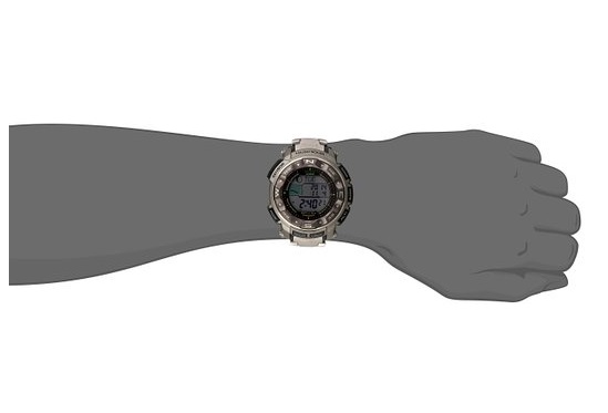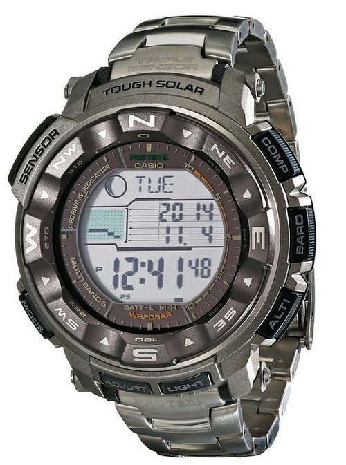 CASIO 卡西欧的这款PRW2500T-7CR,表带和表壳均采用钛合金材质,不刺激皮肤并且非常轻,抗低温-10°,卡西欧登山系列当家技术三重感应器:数字罗盘、温度计、高度计,太阳能驱动,六局电波校时功能可接受到国内的电波,5组独立闹铃,整点报时,全自动背光,可显示潮汐和月相,200米防水。