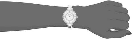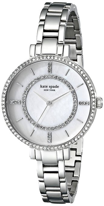 这款凯特·丝蓓kate spade new york Gramercy女士时尚石英手表内置精确日本石英机芯,外观采用银色不锈钢表壳表链设计,表框周围镶嵌一圈水晶,晶莹剔透,奢华闪耀,防刮耐磨矿物玻璃表镜下为白色珍珠母贝表盘,表盘上镶有银色全时刻度,银色时分秒指针,表盘直径34mm,防身深度30m。