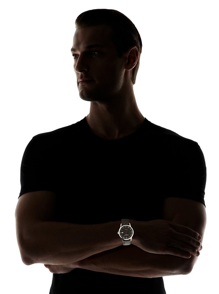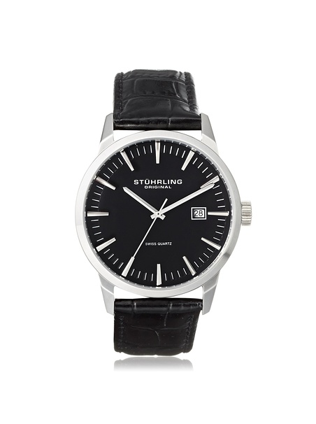 这款斯图灵Stuhrling Original经典男士手表,内置优质瑞士石英机芯,保证了时间的精确,外观采用黑色真皮表带搭配银色不锈钢表壳,经典优雅,气质非凡,防刮耐磨矿物玻璃表镜下为黑色表盘,表盘上镶有银色全时刻度,精确到秒,3点钟方向为日历显示窗,银色时分秒指针,表盘直径32mm,防水深度50m。