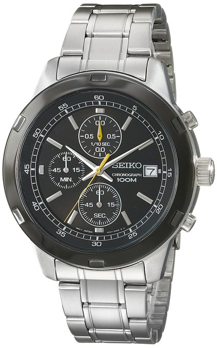 这款SEIKO 精工 SKS435 3眼计时男表,采用日本产石英机芯,黑色表盘,银色时针、分针和时标,动感骚黄小秒针和1/10计时针。黑色不锈钢表壳,银色表带,3点钟日期显示,3个子表盘可0.1秒,60秒和60分计时。表径44mm,厚度11mm,耐磨Hardlex表镜,防水100米。