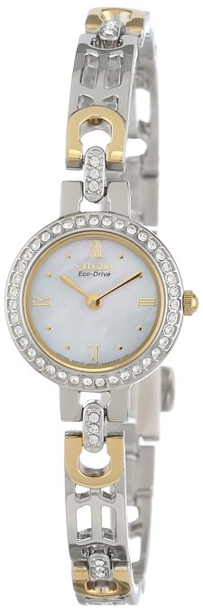 这款西铁城女士时尚光动能石英手表内置精确日本石英机芯,采用Eco-Drive光动能技术利用自然光功能,无需更换电池,节能环保,外观采用金银配色表壳表链设计,表框周围镶嵌水晶,晶莹剔透,奢华闪耀,防刮耐磨矿物玻璃表镜下为白色珍珠母贝表盘,表盘上镶有金色全时刻度,金色时分指针,表盘直径21mm,防水深度30m。