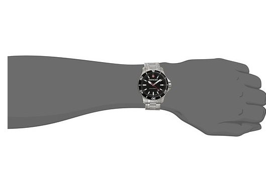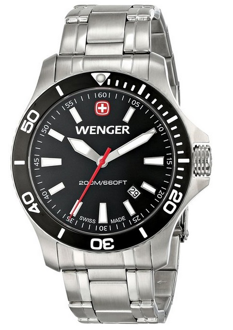 威戈Wenger 0641.105 Sea Force 3H 蓝宝石镜面钢带石英手表,采用瑞士石英机芯,走时精准,43mm表径,银色精钢表带,黑色表盘,红色秒针,200米防水,带有日期功能,12点钟处威戈瑞士十字标志,象征瑞士军刀品质,