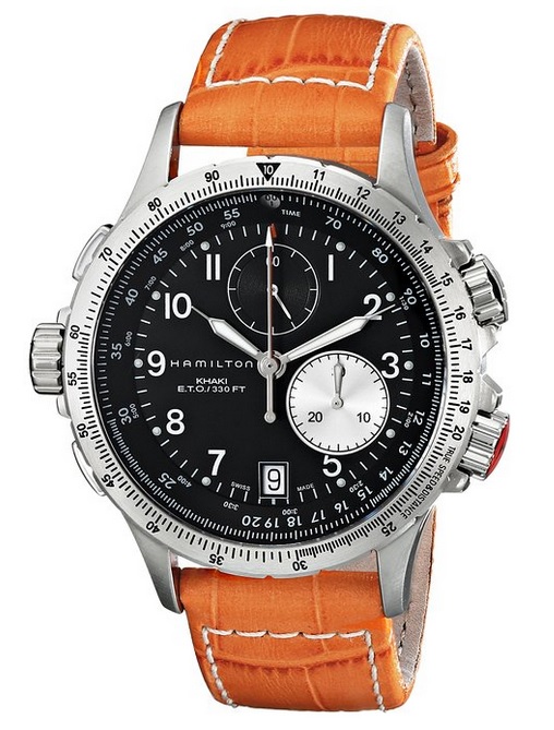 Hamilton汉密尔顿 H77612933 Khaki卡其瑞士制造多功能双时区男表,这款手表属于卡其航空系列,42mm表径,不锈钢表壳,蓝宝石水晶玻璃镜面,造型设计独特,橙色牛皮表带,时尚独特,100米防水,双时区设计,方便出差人员使用!