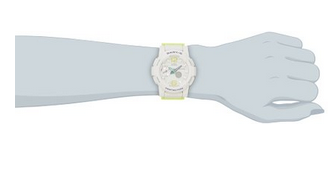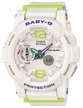 这款手表的型号是 BGA-180,是属于 G-LIDE 系列的冲浪手表,具有潮汐显示功能,在表盘上潮汐信息一目了然。手表防水深度100米,还有有温度测量功能,喜欢冲浪的女士们可以通过它了解潮汐和温度状况,随时随地准备运动。手表白色的表身搭配浅绿色的点缀,活泼可爱。外壳是抗刮、抗腐蚀的树脂材料,在运动的时候不用担心被汗液或者海水腐蚀。立体设计的表盘除时间指针外,还有潮汐窗口和一个数字窗口,数字窗口可以显示世界时间(支持48个城市),支持秒表、闹钟和倒计时等基础功能。表盘宽度44mm,表带长度在12.5—18厘米之间。现美亚好价只需115.87美元,转运到手约¥760(海淘教程)