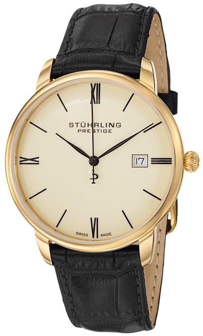 这款Stuhrling Prestige 307L.333515 斯图灵男士23k镀金石英手表,内置优质瑞士石英机芯,保证了时间的精确,外观采用黑色真皮表带搭配23K镀金不锈钢表壳设计,经典尊贵,防刮耐磨矿物玻璃表镜下为淡黄色表盘,表盘上镶有黑色全时刻度,3点钟方向为日历显示窗,黑色时分秒指针,表盘直径40mm,防水深度360m。