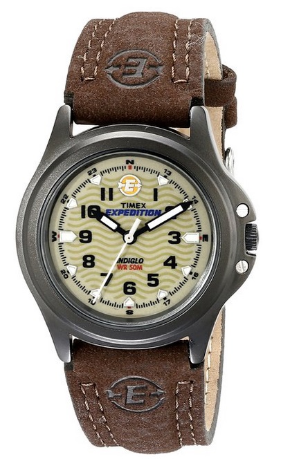 天美时Timex T47042 Expedition Metal 复古女表,棕色复古皮带,圆形表盘,其实说是女表,男生戴也是没问题的!采用独家的Indiglo夜光等技术,这是 Timex公司独创的核心技术——一种亮度极大的夜光灯!