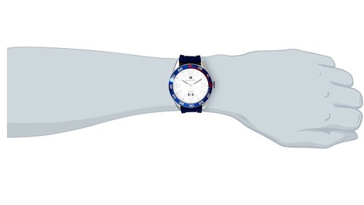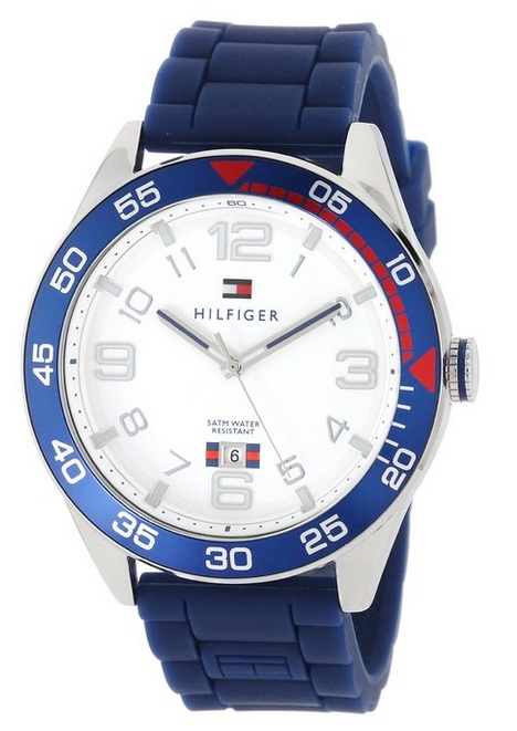 Tommy Hilfiger汤米 希尔费格1790977 系列指针石英手表,这款蓝色表带、表壳的石英表绝对是时尚达人的不二选择, 超酷白色表盘,搭配外圈四分之一红色刻度,45mm表径,50米防水,6点处日期功能,12点下方有西格菲尔标志!