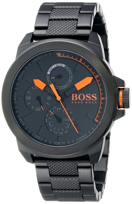 这款雨果·波士 BOSS Orange 男士手表内置精确日本石英机芯,外观采用黑色不锈钢表壳表链设计,酷劲十足,防刮耐磨矿物玻璃表镜下为黑色表盘,表盘带有橙色刻度和指针,日历副表盘方便读取,表盘直径46mm,防水深度30m。