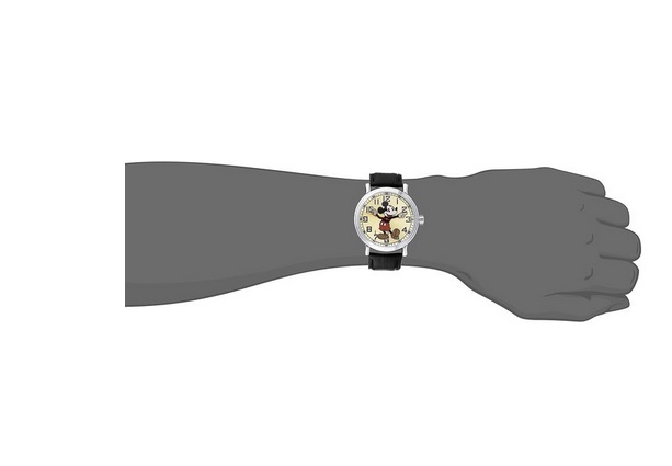 迪士尼Disney Men's 56109 "Vintage Mickey Mouse" Watch with Black Leather Band 米老鼠男款手表,采用日本石英机芯走时精准,表盘上是早期的米老鼠图案,那时候的米老鼠形象跟现在还是有点区别的,主要是眼睛这里,米老鼠的两只手分别代替分针和时针的设计相当有新意,适合童心未泯的你佩戴!
