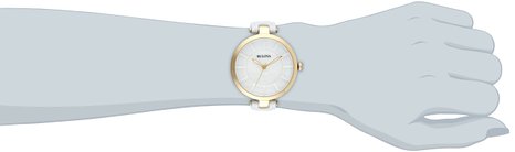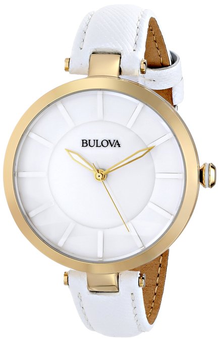 这款宝路华女士时尚石英手表,内置精确日本石英机芯,外观采用白色真皮表带搭配金色不锈钢圆形表壳设计,优雅靓丽,时尚大方,防刮耐磨矿物玻璃表镜下为白色表盘,表盘上镶有白色全时刻度,金色时分秒指针,表盘直径38mm,防水深度30m。