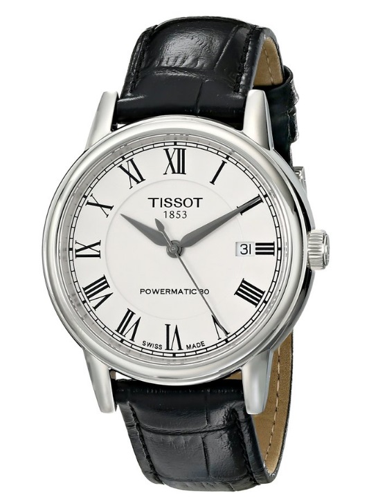 Tissot天梭 T0854071601300 CARSON瑞士自动机械典藏男表,38mm不锈钢表盘,灰色指针、黑色刻度搭配纯白色表面,蓝宝石水晶玻璃镜面,3点处有日历功能,30米防水,能够阻挡日常的一些小水渍。