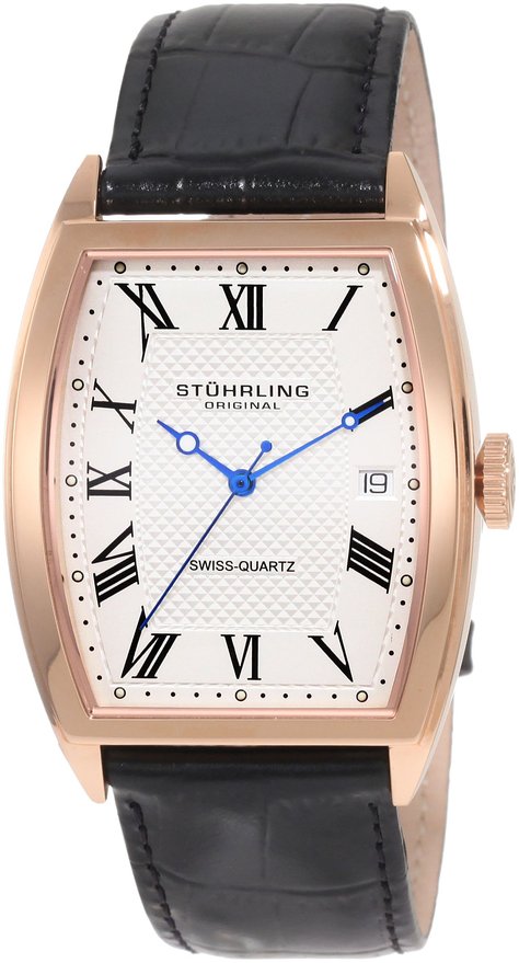 这款 Stuhrling Original 241.33452 斯图灵男士经典石英手表,内置优质瑞士石英机芯,保证了时间的精确,外观采用黑色真皮表带搭配玫瑰金不锈钢表壳设计,尊贵经典,防刮耐磨矿物玻璃表镜下为白色纹理表盘,表盘上镶有黑色罗马数字刻度,边缘精确到秒,3点钟方向为日历显示窗,蓝色时分秒指针,表盘直径42mm,防水深度50m。